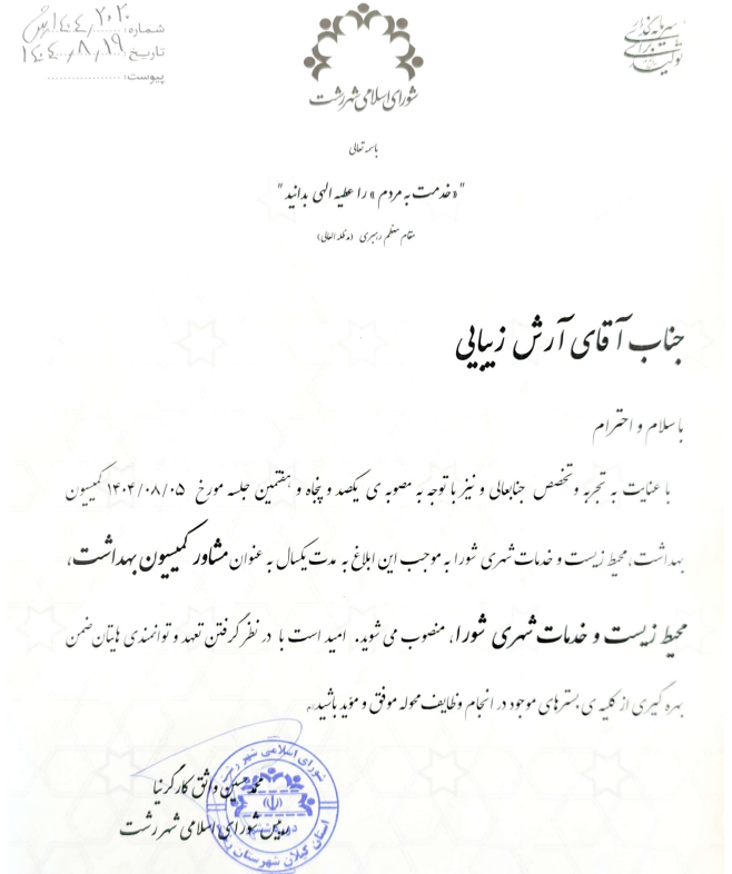 در طی حکمی از سوی محمد واثق کارگرنیا رئیس شورای اسلامی شهر رشت، جناب آقاي دكتر آرش زيبايي استاد گروه گیاه پزشکی به سمت مشاورت کمیسیون، بهداشت، سلامت و خدمات شهري شوراي اسلامی شهر رشت منسوب شدند. ضمن عرض تبریک از خداوند منان برای ایشان آرزوی موفقیت های روزافزون را داریم.