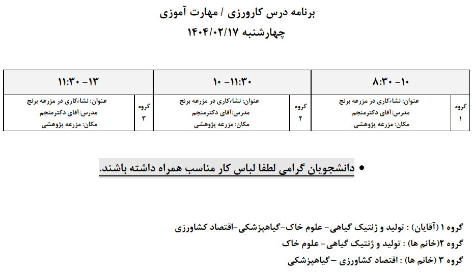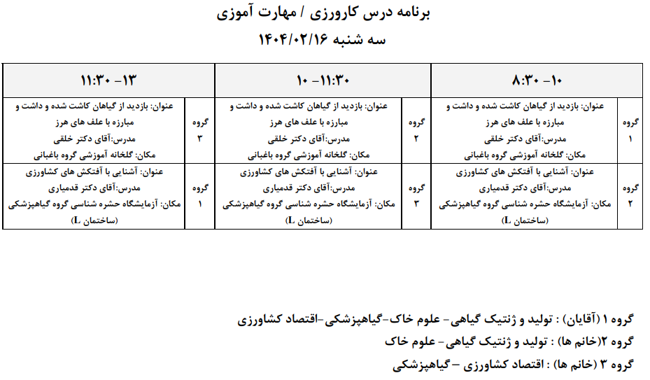 برنامه درس كارورزي/ مهارت آموزي 16 و 17 ارديبهشت