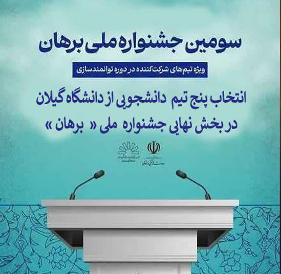 براساس اعلام نتایج داوری آثار جشنواره ملی برهان ویژه کرسی‌های آزاد اندیشی دانشگاه‌ها و مراکز آموزش عالی  کشور، پنج تیم از دانشگاه گیلان برای حضور در بخش نهایی این جشنواره پذیرفته شدند.  در بین دانشگاه‌های حاضر در این رقابت ملی، دانشگاه گیلان با ترکیب پنج تیم شامل انجمن علمی «ایران» به سرپرستی زهرا قبادپور، انجمن علمی «سداد» به سرپرستی امیرمهدی علی‌محمدی، گروه مستقل «جریان» به سرپرستی فاطمه ارجمند، گروه مستقل «آوانگارد» به سرپرستی امیرحسین شعبانی و کانون فرهنگی و اجتماعی «گردشگران صلح» به سرپرستی حمیدرضا فلاح؛ در مرحله نهایی حضور داشته و با پشتوانه مشارکت فعال در دوره‌های توانمندسازی و موفقیت در داوری‌های تخصصی، نمایندگان دانشگاه گیلان در بخش نهایی جشنواره ملی «برهان» خواهند بود. شایان ذکر است نخبگان دانشگاهی، فعالین انجمن‌های علمی، شاخصین کانون‌های فرهنگی و هنری و فرهیختگان تشکل‌های اسلامی با فراخوان معاونت فرهنگی و اجتماعی وزارت عتف برای ثبت و ارسال آثار در بخش‌های چهار گانه‌ی «علم و دانشـگاه در ایران، وقتی دانشگاه، خودش را بازمی‌پرسد»؛ «مسائل ملی و محلی؛ چالش‌هایی که با ما بزرگ شده‌اند»؛ «مسائل جهانی؛ جهان، در خانه‌ی ماست»؛ «جنگ و پساجنگ؛ از سنگر تا سطر، از ملت تا جهان» مشارکت نمودند و پس از بررسی و ارزیابی اولیه برای شرکت در دوره توانمندسازی در آبان‌ماه 1404 انتخاب شدند. گفتنی است تیم‌های فعال و اندیشه‌ورز از دانشگاه‌های سراسر کشور در بازه زمانی تعیین شده پس از مرحله ارزیابی، با تکمیل «بوم مسأله‌شناسی»، بسط و تبیین محور و موضوع انتخابی خود جهت شرکت در بخش نهایی جشنواره داوری تخصصی شدند و در این جشنواره که در بهار سال 1405 در یکی از دانشگاههای معتبر کشور برگزار خواهد شد حضور خواهد یافت.